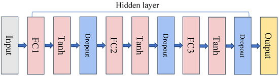Schematic representation of the Deep Neural Network (DNN) model used in this study. The model consists of an input layer, three hidden layers, and an output layer. Fully Connected Layer (FC) that connects each neuron to all neurons in the previous layer. Activation Function (tanh) is applied after the fully connected layer, introducing non-linearity into the model. Dropout is then applied to prevent overfitting by randomly dropping out a fraction of input neurons. The Output Layer generates risk scores for each patient. Although not explicitly shown in the diagram, all weights in the model are subject to L1 and L2 regularization during training to further prevent overfitting and encourage feature sparsity.