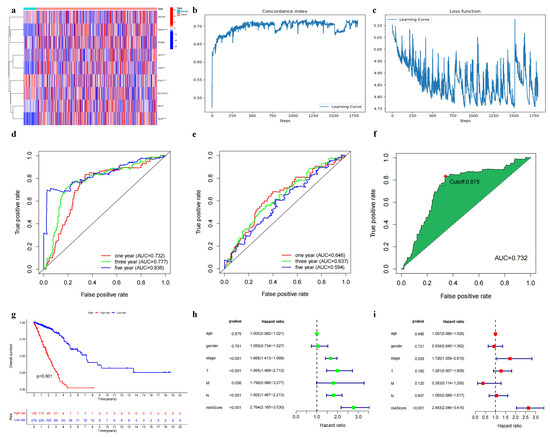 Screening cuproptosis-related differential genes using TCGA data and developing a DNN model. (a) Nine cuproptosis-related differential genes.Asterisks represent levels of statistical significance: * p < 0.05, ** p < 0.01, *** p < 0.001. (b) C-index plot of the DNN prognostic model. (c) Loss plot of DNN prognostic model. (d) ROC curve of DNN prognostic model. (e) ROC curve of the Cox prognostic model. (f) Determining Youden index values (optimal thresholds for separating the different risk groups) through ROC curves.The red dot represents the optimal cutoff point. (g) Survival curves based on subgroups. (h) Single-factor Cox independence test. (i) Multi-factor Cox independence test.