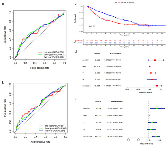 To validate the performance of our DNN model, we utilized the GEO dataset comprising 443 selected samples. These samples were first normalized to a “0–1” scale and were subsequently subjected to risk score calculation using the DNN model. The samples were then stratified into distinct risk groups based on the optimal threshold value derived from the Youden index. The DNN model’s performance was evaluated by plotting ROC curves (Figure 4a) for 1, 3, and 5 years and then comparing it with the conventional Cox model (Figure 4b). The comparison demonstrated the superiority of the DNN model over the Cox model at all three time points (Year 1: 0.606 vs. 0.601; Year 3: 0.621 vs. 0.586; Year 5: 0.603 vs. 0.584), indicating the robustness and improved predictive ability of our model (as shown in Table 1). Additionally, we generated survival curves (Figure 4c) for the validation set, which revealed a considerable divergence between the risk groups. The high-risk group exhibited a shorter time to half-death compared to the low-risk group, emphasizing the model’s capacity to discriminate between patients with different prognoses. To further verify the model’s independence and generalizability, we conducted an analysis of variance (Figure 4d,e). The results confirmed that the DNN model maintained its predictive power and independence in the external validation set, highlighting its potential as a reliable prognostic tool for clinical applications.