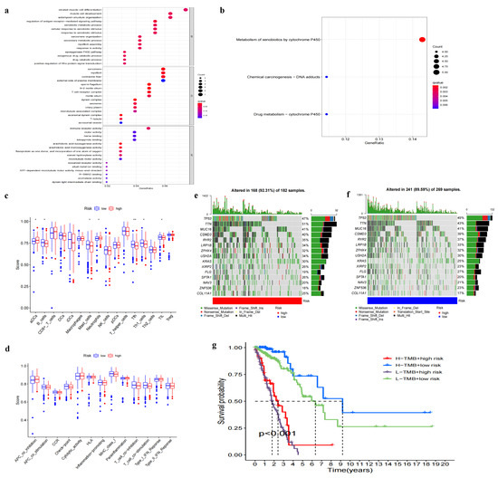 To delve deeper into the biological significance of the different risk groups, we performed Gene Ontology (GO) and Kyoto Encyclopedia of Genes and Genomes (KEGG) functional enrichment analyses. These analyses were intended to identify potential differences in gene function and metabolic pathways among the risk groups. The differentially expressed genes (DEGs) were identified using a Wilcoxon test, with a false discovery rate (FDR) of <0.05 and an absolute log2 fold change (|log2FC|) of ≥1 serving as the selection criteria. We identified 514 DEGs, of which 508 were down-regulated and only six were up-regulated. Enrichment analyses of these DEGs pointed to significant variations in functions such as striated muscle cell differentiation, sarcomere organization, and immune receptor activity, as visualized in Figure 6a. Discrepancies were also observed in pathways, particularly in the metabolism of xenobiotics by cytochrome P450 (Figure 6b). Furthermore, we noticed distinct differences in the immune microenvironment between risk groups. We performed a single sample gene set enrichment analysis (ssGSEA) to evaluate 16 immune cell enrichments and 13 pathway activities, finding that the high-risk group exhibited lower levels of immune cell and pathway activities than the low-risk group. This difference was especially pronounced for Tfh, aDCs, B cells, Mast cells, Neutrophils, Th1 cells, and TIL as shown in Figure 6c,d. To explore the potential impact of tumor mutational burden (TMB) on patient survival, we calculated TMB scores for each sample and categorized them into high or low TMB groups. Waterfall plots of the top 15 genes in both TMB groups highlighted patterns of difference between them (Figure 6e,f). Finally, we integrated the TMB analysis with our risk model and found that patients with a high-risk score and low TMB had the poorest survival outcomes, thereby suggesting that our risk model might be a stronger predictor of survival than TMB alone (Figure 6g).