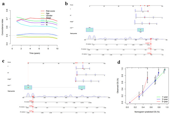 Individualized prognostic prediction nomogram model building, * p < 0.05, *** p < 0.001. (a) Plot of 0–10 year C-index curve based on DNN (riskscore) and clinical information. (b) Nomogram model of a high-risk patient TCGA-NJ-A7XG. (c) Nomogram model of a low-risk patient TCGA-78-7540. (d) Calibration curves for model years 1, 3, and 5.