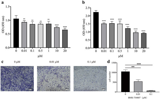 Effect of BMS-754807 on the activity of LUAD A549 cell line. (a) 24 h of CCK-8 experiment results, ** p < 0.01, **** p < 0.0001. (b) 72 h of CCK-8 experiment results, **** p < 0.0001. (c) The migration ability of different concentrations of BMS-754807 on A549 cells was assayed by Transwell chamber. (d) Quantitative statistics of migration ability, *** p < 0.001, **** p < 0.0001.