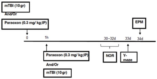 - mTBI + paraoxon group (TBI, post-paraoxon): The mice were exposed to mTBI followed by paraoxon administration after 1 h. Paraoxon was diluted in 0.9% saline and absolute ethanol (dehydrated, 99%) and administered by IP injection at a dose of 0.3 mg/kg.