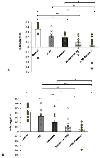 Spatial and visual memory deficits were more pronounced when paraoxon was administered after mTBI compared with exposure to mTBI alone. This finding supports the existing hypothesis that mTBI can cause blood–brain barrier dysfunction. Therefore, the combination of mTBI and paraoxon is more detrimental to spatial and visual memory [39].