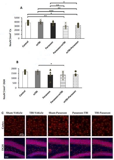 The number of NeuN+ neurons in the dentate gyrus (Figure 3B) was analyzed using a one-way ANOVA with an LSD post hoc analysis: [F(4, 20) = 1.945, NS = 0.142]. Significant differences were found in the DGH between the mTBI and paraoxon + mTBI groups (p = 0.049). No significant difference was found between mTBI and mTBI + paraoxon groups.