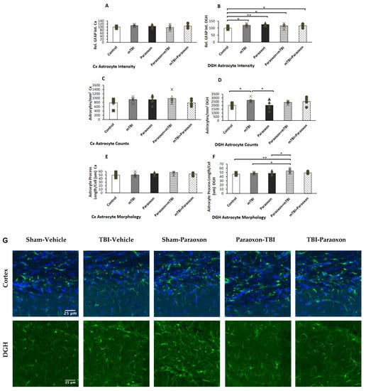 Astrocyte changes in the cortex and hippocampus of control (n = 5), mTBI (n = 5), paraoxon (n = 5), paraoxon + mTBI (n = 5), and mTBI + paraoxon (n = 5) mice. Paraoxon increases active astrocyte expression in the DGH only and changes astrocyte morphology before mTBI. The graphs present quantifications of: (A) GFAP intensity in the temporal cortex; (B) GFAP intensity in the DGH; (C) astrocyte counts in the temporal cortex; (D) astrocyte counts in the DGH; (E) astrocyte morphology in the temporal cortex; and (F) astrocyte morphology in the DG. Representative images of immunohistochemical staining in the DGH and the temporal cortex are presented in (G). GFAP-positive cells are shown in green, and nuclei are shown in blue. Scale bars are 25 μm. * p < 0.05, ** p < 0.01.