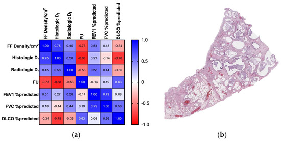 Correlation table and histologic depiction of UIP pattern: (a) This correlation table shows a summary of the main result in shadows of blue (positive correlation: 1 = perfect positive correlation) and red (negative correlation: −1 = perfect inverse correlation); (b) Histologic UIP pattern at low power, characterized by honeycombing, architectural distortion, and temporal inhomogeneity (1× original magnification, Hematoxylin and Eosin stain).