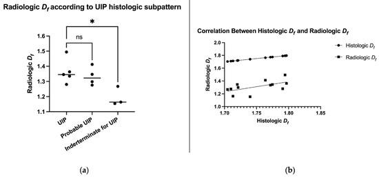 Df was inversely correlated with DLCO (−0.77, p < 0.005) and positively correlated with follow-up time (+0.63 p < 0.05). Histologic Df positively correlated with radiologic Df (+0.58, r2 = 0.34 p < 0.05 Figure 3a). Radiologic Df in the histologic UIP certain pattern was significantly different compared to the histologic UIP indeterminate sub-category (1.36 vs. 1.19 p > 0.05 Figure 3b).