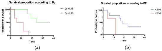 Survival analysis showed a Df > 1.75 to detect a category of patients with worse prognosis and overall survival <18 months; the same category of patients showed FF consistently higher compared to those with a lower Df (Figure 4).