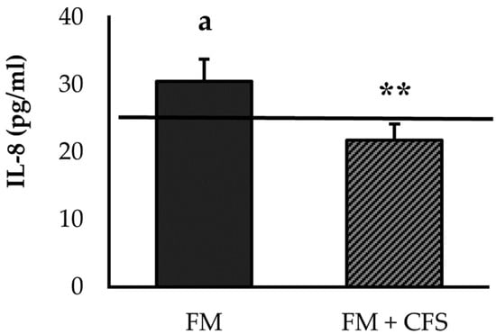 FM patients with a previous CFS diagnosis had a significantly lower concentration of IL-8 than patients without CFS (p < 0.01; Figure 1). No significant differences in serum levels of IL-8 were found between FM patients with a previous CFS diagnosis and the reference group. However, FM patients without CFS presented higher serum IL-8 levels compared to the reference group (p < 0.05), which were also above the reference value (>29 pg/mL) obtained in numerous studies in FM patients of our research group [3,4,5].