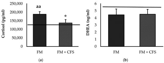 Serum levels of cortisol (a) and DHEA (b) in FM patients with (FM + CFS, n = 17) or without (FM, n = 17) CFS diagnosis. The horizontal line represents values obtained in the age-matched reference group of “healthy” women. Columns represent the mean ± SEM of independent assays performed in duplicate for each participant. DHEA: Dehydroepiandrosterone, FM: Fibromyalgia, CFS: Chronic Fatigue Syndrome. * p < 0.05 with respect to FM group. aa p < 0.01 with respect to the reference group. (Mann–Whitney u-test).