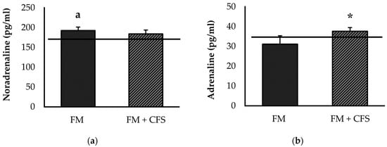 Serum levels of noradrenaline (a) and adrenaline (b) in FM patients with (FM + CFS, n = 17) or without (FM, n = 17) CFS diagnosis. The horizontal line represents values obtained in the age-matched reference group of “healthy” women. Columns represent the mean ± SEM of independent assays performed in duplicate for each participant. FM: Fibromyalgia, CFS: Chronic Fatigue Syndrome. * p < 0.05 with respect to FM group. a p < 0.05 with respect to the reference group. (Student’s t-test).