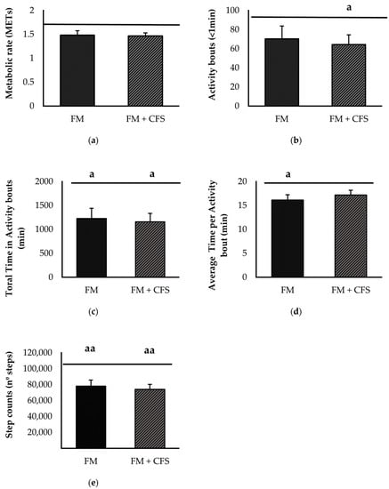 Physical activity levels determined via accelerometry: Metabolic rate (a) activity bouts (b), total time in activity bouts (c), average time per activity bout (d) and steps counts (e) in FM patients with (FM + CFS, n = 17) or without (FM, n = 17) CFS diagnosis. The horizontal line represents values obtained in the age-matched reference group of “healthy” women. Columns represent the mean ± SEM of independent assays performed in duplicate for each participant. FM: Fibromyalgia, CFS: Chronic Fatigue Syndrome, MET: Metabolic Equivalent of Task. a p < 0.05, aa p < 0.01 with respect to the reference group. (Student’s t-test).