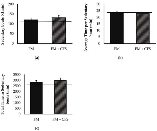 Levels of sedentary lifestyle determined by accelerometry: sedentary bouts (a) total time in sedentary bouts (b), average time per sedentary bout (c) in FM patients with (FM + CFS, n = 17) or without (FM, n = 17) CFS diagnosis. The horizontal line represents values obtained in the age-matched reference group of “healthy” women. Columns represent the mean ± SEM of independent assays performed in duplicate for each participant. FM: Fibromyalgia, CFS: Chronic Fatigue Syndrome (Mann–Whitney u-test).
