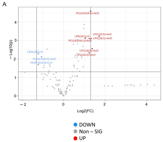 The Bligh and Dyer method was used to extract lipids from each sample [23], which was then adjusted to 1 mL with reagent-grade water and incubated for 10 min on ice. Subsequently, 2 mL of methanol and 0.9 mL of methylene chloride were added to the mixture that was vortexed for a duration of 30 s. A mixture of EquiSPLASH Lipidomix (Avanti Polar Lipids, Inc., Alabaster, AL, USA) consisting of 13 deuterated lipids at a concentration of 100 µg/mL was used as an internal standard. The deuterated lipids included 15:0–18:1(d7) diacylglycerol (DAG); 18:1(d7) monoacylglycerol (MAG); d18:1–18:1(d9) sphingomyelin (SM); C15 ceramide (CER)-d7; 15:0–18:1(d7)–15:0 triacylglycerol (TAG); 18:1(d7) cholesteryl ester (CE); 15:0–18:1(d7) phosphatidylcholine (PC); 18:1(d7) lysophosphatidylcholine (LPC); 15:0–18:1(d7) phosphatidylglycerol (PG); 15:0–18:1(d7) phosphatidylinositol (PI); 15:0–18:1(d7) phosphatidylethanolamine (PE); 18:1(d7) lysophosphatidylethanolamine (LPE); and 15:0–18:1(d7) phosphatidylserine (PS). Dilutions of 1:5 were made of the internal standards and a total of 50 μL (20 μg/mL for each standard) was added to each sample and incubated for a duration of 30 min at room temperature. Thereafter, 0.9 mL of methylene chloride and 1 mL of reagent-grade water were mixed by inversion 10 times, followed by centrifugation at 100× g for 10 min. After a second round of extraction was performed with 2 mL of methylene chloride, the pooled organic phases were dried with N2, resuspended in 50 µL of 96% ethanol, and analyzed using liquid chromatography—mass spectrometry.