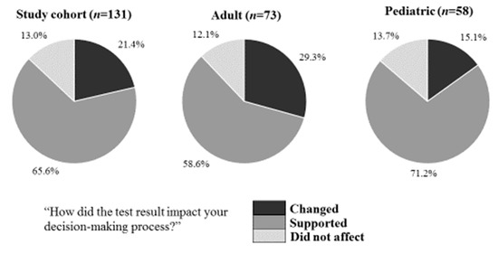 In addition to the BV results, physicians had access to X-ray results, blood tests and other supporting information prior to making their final prescription decision. To better understand the impact specifically of BV on their decision-making process, physicians were asked to report whether the test impacted their patient management decision. Physicians reported that BV changed their decision regarding antibiotic treatment for 21.4% (28/131) of patients. Furthermore, physicians reported that BV supported their decision making in an additional 65.6% (86/131) of cases and did not affect them in 13.0% (17/131) of the cases (Figure 3). Overall, physicians reported BV had a positive impact on patient management in 87.0% of cases in which BV results were either bacterial or viral (114/131, CI90%: 81.4–91.2%, p < 0.05) and for 100.0% of the twelve elderly patients.