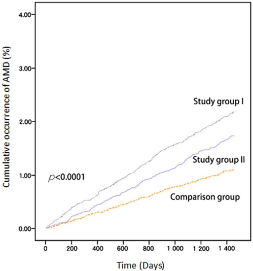 Kaplan–Meier curve of cumulative occurrence of AMD among the three groups: study group I, hyperlipidemia with antihyperlipidemia agents; study group II, hyperlipidemia without antihyperlipidemia agents; comparison group, nonhyperlipidemia without antihyperlipidemia agents. p < 0.0001 in log-rank test. AMD, age-related macular degeneration.