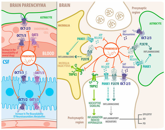 - Colín-González, A.L.; Santamaría, A. Probenecid: An emerging tool for neuroprotection. CNS Neurol. Disord. Drug Targets 2013, 12, 1050–1065. [Google Scholar] [CrossRef] [PubMed]