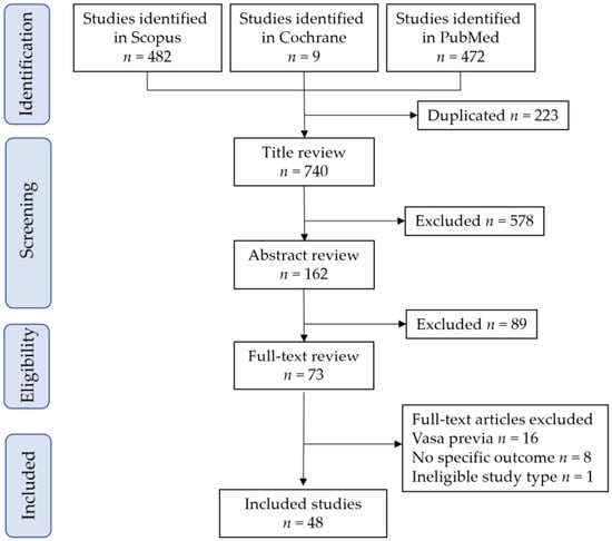 - Takemoto, Y.; Matsuzaki, S.; Matsuzaki, S.; Kakuda, M.; Lee, M.; Hayashida, H.; Maeda, M.; Kamiura, S. Current evidence on vasa previa without velamentous cord insertion or placental morphological anomalies (type III vasa previa): Systematic review and meta-analysis. Biomedicines 2023, 11, 152. [Google Scholar] [CrossRef]