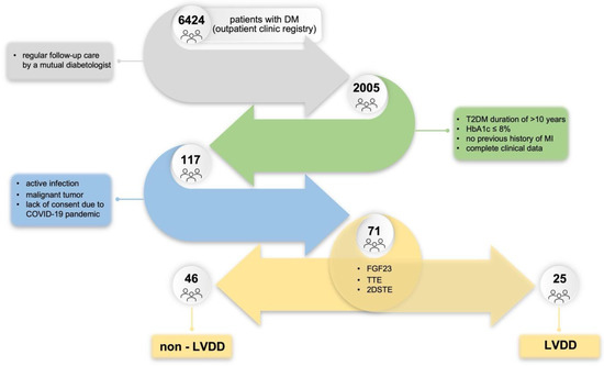 For the present analysis, we included 71 consecutive patients. Data of all individuals were obtained from a Diabetes Outpatient Clinic (Lodz, Poland) database between 2019 and 2021. Patients had the following inclusion criteria: (1) T2DM duration of >10 years; (2) regular follow-up care by a mutual diabetologist; and (3) hemoglobin A1c (HbA1c) ≤ 8% were enrolled in the study, whereas subjects with any of the following conditions were excluded: (1) age < 18 years; (2) previous history of MI; (3) active infection; (4) malignant tumor; (5) no electronic TTE data available for retrospective analysis; or (6) missing key clinical data. Afterwards, participants were divided into two groups according to a diagnosis of left ventricular diastolic dysfunction (LVDD): Group 1 (non-LVDD, n = 46) or Group 2 (LVDD, n = 25). A flowchart of the study is shown in Figure 1.