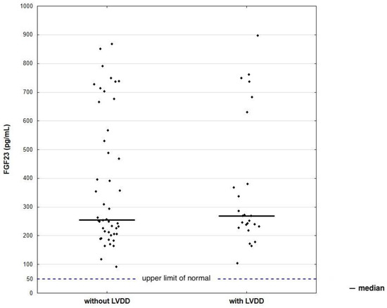 Scatter plot of FGF23 levels according to LV diastolic function status. Abbreviations: LVDD, left ventricular diastolic dysfunction; FGF23, fibroblast growth factor; LV, left ventricular.