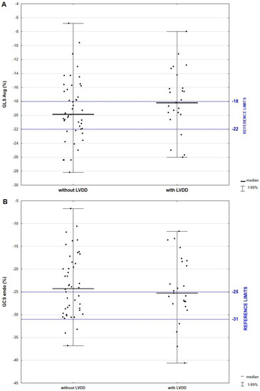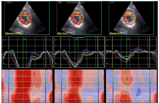 The parameters derived from 2DSTE are listed in Table 4. After considering age dependency, average GCS was diminished in the majority of patients. Average GCS was −16.4%, endocardial GCS was −24.8%, whereas epicardial GCS was considerably reduced and amounted to −9.2%. According to Nagata et al., the reference ranges for average, endocardial, and epicardial GCS are, respectively, as follows: −21.2% ± 2.1, −29.3% ± 2.9, and −15.6% ± 1.9 [28]. GLS was within the normal range, which is −19.4% ± 1.7 [28]. Contrary to our expectations, there were no significant differences in GLS and GCS between patients with LVDD and normal LV diastolic function. Even the analysis of a layer-specific GCS did not reveal any correlation with LV diastolic function. The examples of LV CS curves of endocardium, mid-wall, and epicardium from papillary muscles level are illustrated in Figure 4.
