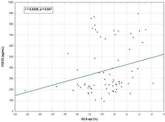 This study also assessed the utility of FGF23 with reference to cardiac strain. It revealed that an epicardial GCS correlated with FGF23 level regardless of LV diastolic function status (p = 0.041), as shown in Figure 5. Such correlation was not found in the following subgroups, patients with LVDD and with normal diastolic function. None of the other strains correlated with the FGF23 levels either in the study population or in patients with LVDD or with normal diastolic function.