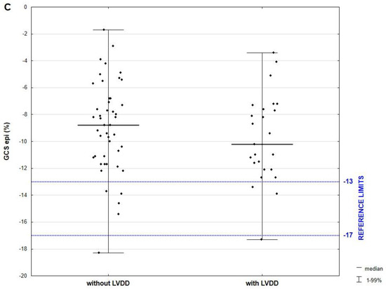 Scatter plot of average GLS (A), GCS endocardial (B), and GCS epicardial (C) levels according to LV diastolic function status. Abbreviations: LVDD, left ventricular diastolic dysfunction; GLS, global longitudinal strain; GCS, global circumferential.