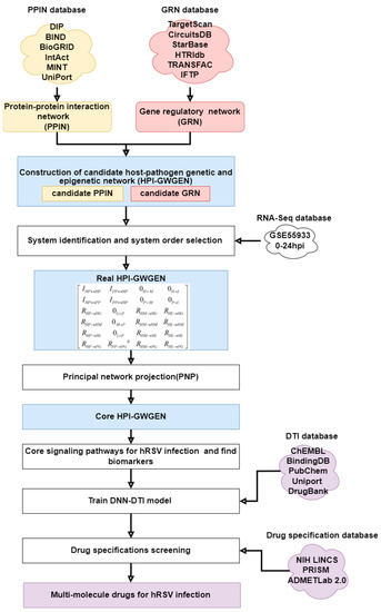 In this study, we established a multistep drug-repurposing workflow which is shown in Figure 1 by system identification, principal host–pathogen network projection, core signaling pathway of hRSV infection, biomarker identification, and drug discovery by a deep neural network-based drug–target interaction (DTI) model and drug design specification. First of all, we constructed a candidate host–pathogen interspecies genome-wide genetic and epigenetic interaction network (HPI-GWGEN) by big-data mining from multiple host–pathogen regulation/interaction databases. Then, we trimmed candidate HPI-GWGEN into real HPI-GWGEN by system identification via two-side host–pathogen time-profile RNA-seq data. The system identification is employed to construct the real HPI-GWGEN by identifying real regulations and interactions between each gene, protein, and virus via two-side RNA-Seq time-profile data of the hRSV and host. Then we prune the false-positive interactions based on system model order by Akaike information criterion (AIC) which can identify the real number of interactions and regulations [7,8,9,10]. Since there are too many interactions and regulations between the nodes of proteins, genes, microRNA, lncRNA, and virus genes in HPI-GWGEN, therefore, we proposed the principal-network projection (PNP) method to calculate the projection value of each node on the principal-network structure (85%) of HPI-GWGEN to rank the significance of each node and to further extract the core HPI-GWGEN from real HPI-GWGEN based on their projection (significance) values. To understand the core signaling pathways of hRSV infection, we used DAVID (database for annotation, visualization, and integrated discovery) and the annotation of KEGG pathways to obtain the core HPI signaling pathways of hRSV infection. After obtaining the core HPI signaling pathways and their downstream cellular dysfunctions in the hRSV infection progression to further investigate the pathogenic mechanism of hRSV infection, consequently, we selected several significant biomarkers i.e., IRF3, STAT3, TRAF6, TYK2, and MAVS as the drug targets for therapeutic treatment of hRSV infection. Then, we designed a DNN (deep neural network) as drug–target interaction (DTI) model to be trained by the drug–target interaction from drug–target interaction databases. After the training of the DTI model, we could predict the candidate multimolecule drugs which interact with these significant biomarkers we selected. Finally, we could evaluate the potential multimolecule drug based on drug design specifications such as regulation ability, high sensitivity, adequate excretion, toxicity, and drug-likeness as a selection benchmark. After all evaluations of systematic drug selection, we purposed acitretin, RS-67333, and phenformin to construct a multimolecule drug as the clinical-trial recommendation for hRSV treatment.