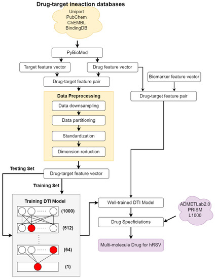 Before training the DNN model as a DTI model by drug–target interaction database to predict potential molecular drugs for each biomarker of hRSV infection, we first preprocessed the drug–target interaction (DTI) data as shown in Figure 2. We collected the drug–target interaction data from several DTI databases including ChEMBL, BindingDB, Pubchem, UniProt, and DrugBank. In order to input these data into the DNN model, we must transform them into numerical vectors. We utilized PyBioMed to transform drug chemical structures and protein sequences into numerical feature vectors. At the same time, the drug feature vector and protein feature vector were concatenated as the following drug–target vector: