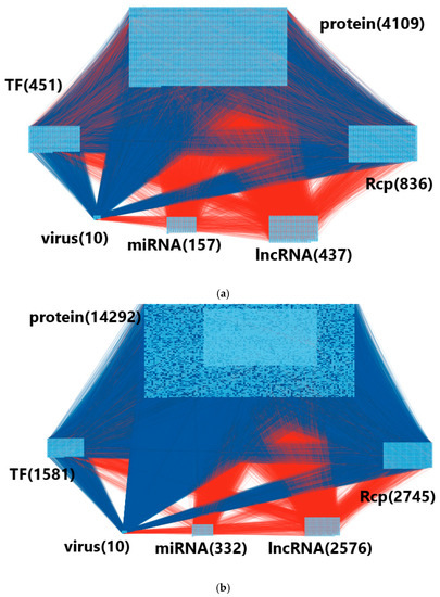 (a) Visualization of core HPI-GWGEN of hRSV infection. (b) Visualization of real HPI-GWGEN of hRSV infection. The real HPI-GWGEN of hRSV infection is obtained by pruning false positives from candidate HPI-GWGEN by AIC system order detection and system identification method via two-side HPI time-profile RNA-Seq data, and then core HPI-GWGEN is obtained by 6000 significant nodes of real HPI-GWGEN by PNP method in (22)–(24). The blue lines represent the protein–protein interaction, and the red lines represent the gene-regulation relationship. The number of proteins, Rcp (receptor), miRNA, lncRNA, virus gene, and transcription factor (TF) are shown in the figure.