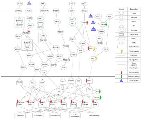 The core HPI signaling pathways of core HPI-GWGEN in Figure 3a, based on the annotation of the KEGG pathways during hRSV infection. These core HPI signaling pathways lead to the upregulations of downstream target genes and consequently regulation of the apoptosis, LPS related, inflammation, cell proliferation, and host defense. The table on the right side describes the meaning of each symbol.