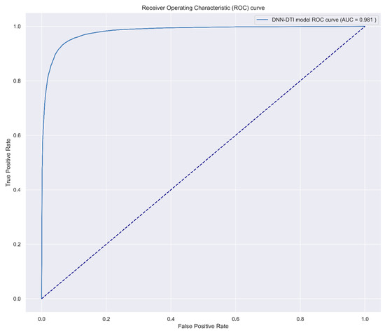 where and represent whether the nth sample is interacted and the probability of the nth sample predicted in the DNN model, respectively. After defining the loss function, we applied ADAM [24] as our backward propagation algorithm and completed the whole DNN-DTI model architecture. The model is trained by Keras with 64 batch size and 200 epochs, and we also proposed 5-fold validation to evaluate the predicted performance of the trained model. To visualize the high performance of the DNN-based DTI model, we plotted the receiver operating characteristic (ROC) curve in Figure 6. ROC curve is used for the binary classification model and is aimed to examine whether the model can distinguish the positive and negative sample. The area under the ROC curve (AUC), which was shown in Figure 6, was also applied for a benchmark in the binary classification problem, and the higher the AUC value, the model performance is better.