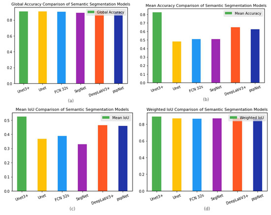 Figure 3 shows the semantic segmentation performance (Metrics) of the six models used in this study, including Unet3+, Unet, FCN-32s, SegNet, pspNet and DeeplabV3+. From Figure 3, we can see that Unet3+ had the highest global accuracy with better mean accuracy, mean IoU and weighted F1 score. Specifically, Unet3+ achieved 0.90 for mean accuracy, 0.82 for mean IoU and 0.52 for mean weighted IoU, while its weighted F1 score was found to be 0.83 with superior Parmas (KB) compared to other models. Although DeepLabV3+ had a higher global accuracy of 0.91 than other models, our analysis showed that Unet3+ outperformed it in terms of overall performance, based on metrics such as mean accuracy, mean IoU, weighted F1-score and Parmas (KB). Figure 4 shows the results presented separately for each model and indicator item, to facilitate comparison between models. Table 2 lists the original data.