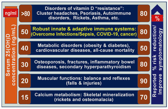 - Wimalawansa, S. Overcoming infections including COVID-19, by maintaining circulating 25(OH)D concentrations above 50 ng/mL. Pathol. Lab. Med. Int. 2022, 14, 37–60. [Google Scholar] [CrossRef]