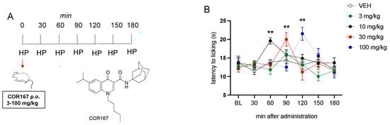 Analgesic activity of COR167 in acute thermal pain. (A) Administration and test schedule. (B) Dose-response curve for the analgesic activity of COR167 (3–100 mg/kg p.o.) in the hot plate test. ** p < 0.01 versus the before-treatment licking latency values (BL).