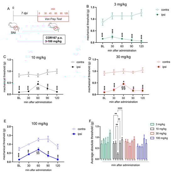 COR167 attenuation of neuropathic pain after acute administration. (A) Experimental protocol. Tests were performed on day 7 post-surgery. (B) COR167 3 mg/kg p.o. was ineffective. (C–E) Dose-dependent attenuation of mechanical allodynia by COR167 (10–30–100 mg/kg p.o. (F) COR167 10 mg/kg p.o. showed the most prominent antiallodynic activity through the evaluation of the average absolute threshold. * p < 0.05, ** p < 0.01, *** p < 0.001, **** p < 0.0001 vs. contralateral side. §§ p < 0.01 vs. BL.