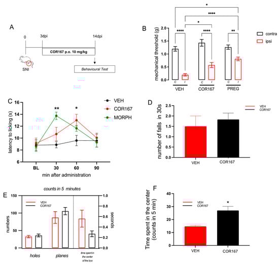 Results obtained following single-dose administration encouraged us to continue investigating the activity of the 10 mg/kg dose following repeated administration. Mice were treated from post-operative day 3 to 14 (Figure 3A). On the 14th day, we measured the mechanical threshold in both hind paws (Figure 3B) (contra and ipsi), the response to thermal hyperalgesia (Figure 3C), motor coordination (Figure 3D), spontaneous locomotor activity (Figure 3E), and anxiety behavior (Figure 3F). The control group (VEH) showed persistent mechanical allodynia in the ipsi-lateral side compared to the contra on post-surgery day 14, as previously observed []. Repeated oral administration of COR167 significantly reduced the allodynia in the ipsilateral side (Figure 3A), with an efficacy comparable to that produced by pregabalin (PREG), a widely employed treatment in the management of neuropathic pain, used as a reference drug. Concerning thermal hyperalgesia, the VEH group showed lower values of latency to licking in the ipsilateral side compared to the contralateral side (13 ± 0.5), which remains stable for the time course. COR167 showed a tendency to reduce thermal hyperalgesia after 30 min, which became significant after 60 min and disappeared after 90 min from administration (Figure 3C). The effect observed at 60 min was of intensity comparable to that shown by MORPH after 30 min of oral administration, which represents the peak of this analgesic drug (Figure 3C). Repeated oral administration of COR167 did not produce an alteration of motor coordination in the rotarod test; indeed, there was not a significant difference in the number of falls compared to the control group (Figure 3D). In the hole board test, COR167 did not show variations in the number of intrusions in the holes or movements on the plane, excluding possible side effects on spontaneous mobility (planes) and exploratory activity (holes) (Figure 3E). Moreover, COR167 increased the time spent in the center of the box in the open field test compared to the untreated group showing an anxiolytic-like activity (Figure 3F).