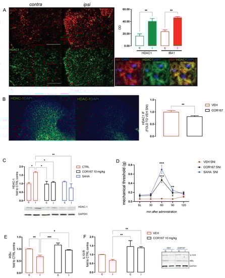 COR167 attenuation of spinal neuroinflammation via an HDAC1-mediated mechanism. (A) Over-expression of IBA1 (red) and HDAC1 (green) in the ipsilateral side (I) of SNI mice spinal cord compared to the contralateral side (C) and their co-localization. ** p < 0.01 vs. contralateral side. (B) COR167 10 mg/kg p.o. repeated administration reduced HDAC1 overexpression in the ipsilateral side (ipsi) of SNI mice in immunofluorescence experiments. ** p < 0.01 vs. vehicle. (C) HDAC1 overexpression in the ipsilateral side was reduced by COR167 treatment with an efficacy comparable to SAHA (10 mg/kg i.p.). * p < 0.05, ** p < 0.01. (D) Time-course curves for COR167 and SAHA in the von Frey test. * p < 0.05, ** p < 0.01, *** p < 0.001 vs. vehicle. (E) Prevention of IkBα decrease by COR167. * p < 0.05, ** p < 0.01, *** p < 0.001. (F) Increase of the IL-10 protein expression by COR167 treatment. ** p < 0.01.