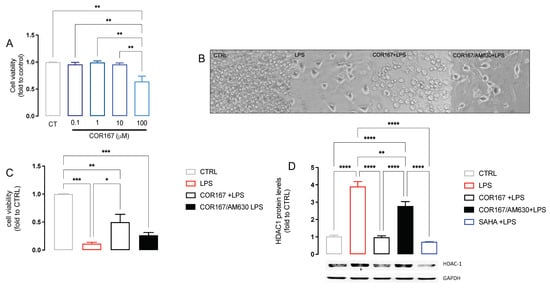 Cells were then pretreated with COR167 and suberoylanilide hydroxamic acid (SAHA, 5 µM) for 4 h and then stimulated with Lipopolysaccharide (LPS, Sigma-Aldrich, Italy) 250 ng mL−1 for 24 h. Both substances were dissolved in DMSO 1% in saline.