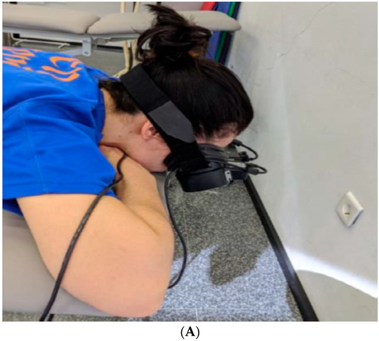 The pupil diameter can serve as a direct measure of the ANS and can be measured by automated pupillometry in real-time [17,19,21,40,41,42]. In this study, the pupil diameter was measured with the fully automated Vorteq® system (Micromedical Technologies, Inc., Chatham, IL, USA). To control light affecting the pupil measures, the subjects wore goggles that covered both eyes to create a completely dark environment. When the eyes are in a dark environment, the parasympathetic activity is greatly reduced. If an increase in pupil diameter occurs (mydriasis), this would indicate an unopposed increase of the sympathetic nervous system [5,42,43]. The Vorteq® system includes two infrared cameras that are built into the goggles. The system will directly and simultaneously measure the pupil diameter of both eyes (Figure 2).