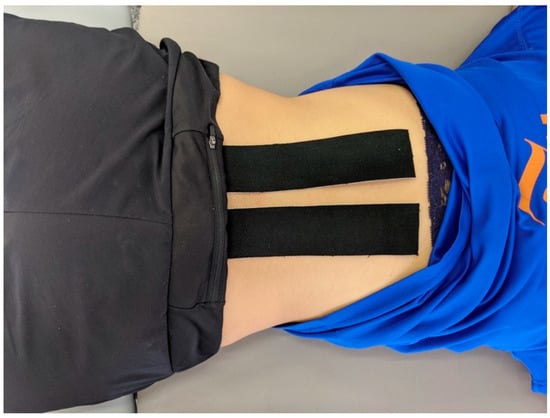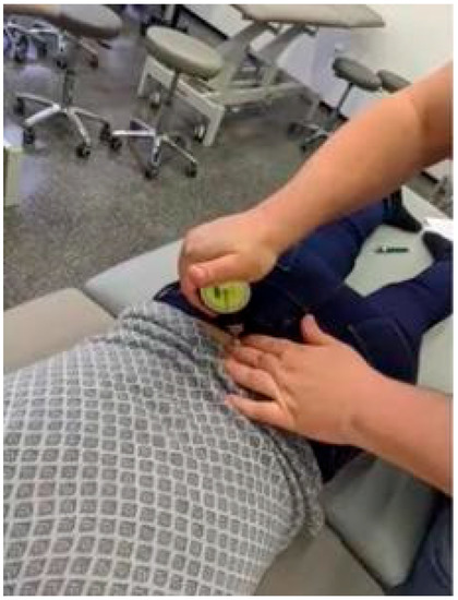 This study consisted of two measuring days in which each participant either received a placebo Kinesio tape or the TCMP (Magnetic Tape®, S.L., Valencia, Spain) intervention (both looked identical and could not be identified by the subject or researcher—physical therapist). Assignment of the intervention sequence was randomized, and the researcher applying the tape was not aware of which tape sample was the magnetic tape (the study tape was identified as tape 1 and tape 2). After providing consent to participate, the subject was positioned on a treatment table in the prone position. In this position, therapist 1 provided a 2 kg manual directed force posterior to anterior (PA) pressure on each spinous process through a pressure pain threshold (PPT) using a Wagner Force Dial FDK 20 algometer (Wagner Instruments, Greenwich, CT, USA) with a 1 cm2 and documented if this pressure would elicit any pain (Figure 3) (dichotomous variable).