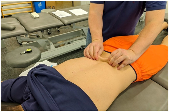 The PA pressure was performed from S3 to C2 (Figure 3). After the PA assessment of the spine, therapist 1 performed the skin pinch test as previously described by Giamberardino et al. [55,56]. During this test, the skin of the back was pinched between the thumb and index finger at each spinal segment and distracted (S3 to C2) to see if this provoked pain (Figure 4).