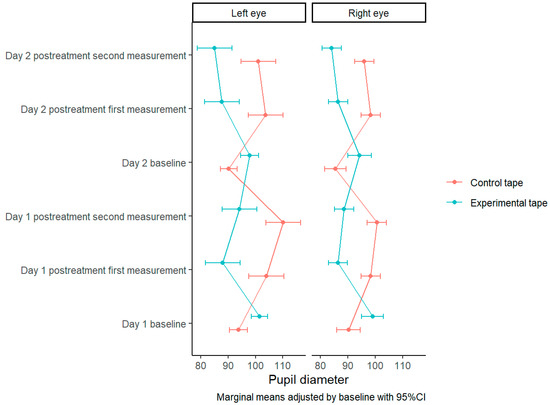 Post hoc tests show that pupillometry values are lower with the TCMP compared to the control tape (86.328 (SE = 1.134) vs. 98.231 (SE = 1.134) in the right eye and 88.772 (SE = 2.069) vs. 104.698 (SE = 2.069) in left eye) and these differences are significant in both, the right (t(64) = 7.077, p ≤ 0.001) and the left eye (t(64) = 5.135, p ≤ 0.001) (Table 3).