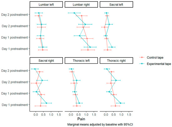 In the pairwise comparisons, it is evident how there is a decrease in perceived pain after the placement of both tapes, more accentuated in the experimental tape group, both at the right thoracic level (0.957 (SE = 0.133) to 0.214 (SE = 0.086) experimental vs. 0.623 (SE = 0.146) to 0.506 (SE = 0.093) control on the first day and 0.656 (SE = 0.146) to 0.066 (SE = 0.093) experimental vs. 0.322 (SE = 0.133) to 0.359 (SE = 0.086) control on the second day) and at the right lumbar level (1.261 (SE = 0.204) to 0.574 (SE = 0.182) experimental vs. 1.12 (SE = 0.222) to 1.056 (SE = 0.198) control on the first day and 0.94 (SE = 0.222) to 0.223 (SE = 0.198) experimental vs. 0.8 (SE = 0.204) to 0.704 (SE = 0.182) control the second day) and also at the right sacral level (0.701 (SE = 0.168) to 0.04 (SE = 0.108) experimental vs. 0.314 (SE = 0.183) to 0.35 (SE = 0.117) control on the first day and 0.414 (SE = 0.183) to -0.057 (SE = 0.117) experimental vs. 0.028 (SE = 0.168) to 0.253 (SE = 0.108) control the second day) (Figure 7 and Supplementary Materials Table S3).