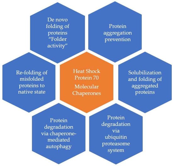 The predominant intracellular function of HSPs is to act as “molecular chaperones” in the cytosol. Research has shown that HSPs aid the cell in folding polypeptides, repair/refold/degrade misfolded proteins, and regulate apoptosis [4,5,6]. Lower concentrations of HSPs are found in the cells during the physiological conditions involved in cellular processes like protein folding, the assembly of macromolecule complexes, and signal transduction [5].