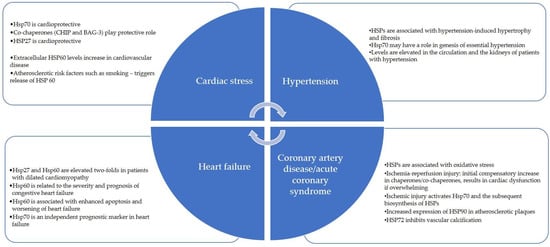With new evidence on the role of various HSPs in disease conditions, novel diagnostic and therapeutic possibilities are surfacing. The elevation of HSPs in plasma can be used as biomarkers for heart failure and atrial fibrillation [48]. Ec-HSP70 and BAG3 are identified as independent prognostic markers of mortality with heart failure and cardiac arrest [95]. BAG-3 has a role in nitric oxide release and is identified in advanced heart failure. It can be useful as a biomarker for advanced heart failure, and has the potential to be used as a novel anti-hypertensive agent [96].