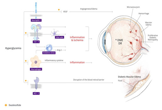 TLR (inhibition of NfKb), NRP-1 (increase reactivity of VEGF 165), and ACE activation have been demonstrated to play key roles in the cascade of events that leads to inflammation and contributes to the progression of DR and nAMD. In a diabetic retina, hyperglycemia enhances the expression and activation of TLR4 in human endothelial cells that may play an important role in DR [11] Cells exposed to high glucose had an increased expression of downstream factors of TLR4 including myeloid differentiation factor 88, an inflammatory cytokine inducer, and NF-κB [158,159], which may lead to the secretion of more inflammatory cytokines like IL-1β [160]. TLR4 polymorphisms were associated with a higher prevalence of retinopathy, further supporting the role of this gene in DR [161,162]. In an oxygen-induced retinopathy model, the absence of TLR4 was seen to be associated with low glial activation and low expression of HMGB-1, the endogenous ligand for TLR4. The expression of HMGB-1 in ischemic retina was shown to promote the production of pro-inflammatory factors and also initiate TLR4-dependent responses that contribute to neovascularization [23]. In fact, TLR4 signaling was implicated in inflammation, leukostasis, angiogenesis, blood–retinal barrier breakdown, hypoxia, cellular apoptosis, neurodegeneration, and oxidative stress in a diabetic retina. This is, therefore, a potential therapeutic target for DR, that has stimulated research around several compounds hypothesized to inhibit this receptor [10]. ACE activation has been implicated in the pathogenesis of DR and DME, potentially causing a disruption of the blood–retinal barrier in diabetic eyes [35,36,37]. Tuftsin, a component of dazdotuftide, has a strong binding affinity to ACE2 [157]. This is therefore another pathological pathway to DR and DME that could be inhibited by dazdotuftide (see Figure 1).