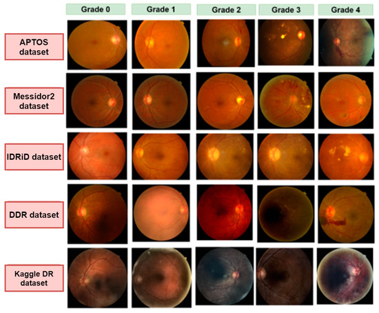 Examples of five grades (grade 0–grade 4) images for five different datasets: APTOS, Messidor2, IDRiD, DDR, and Kaggle DR.