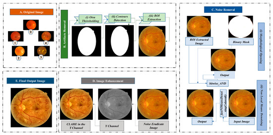 Image pre-processing is essential to improve the quality of the images collected from public datasets. High-quality color retinal images are required for reliable and prompt classification of DR [22]. In this study, five different image datasets are combined. Public datasets of retinal fundus images have been developed with varying resolutions and compression formats and contain background noise [23]. To ensure the quality of the fundus images, we employ various methods to eliminate artifacts, eliminate undesirable noise, and enhance the image. Figure 3 illustrates the process of image pre-processing.